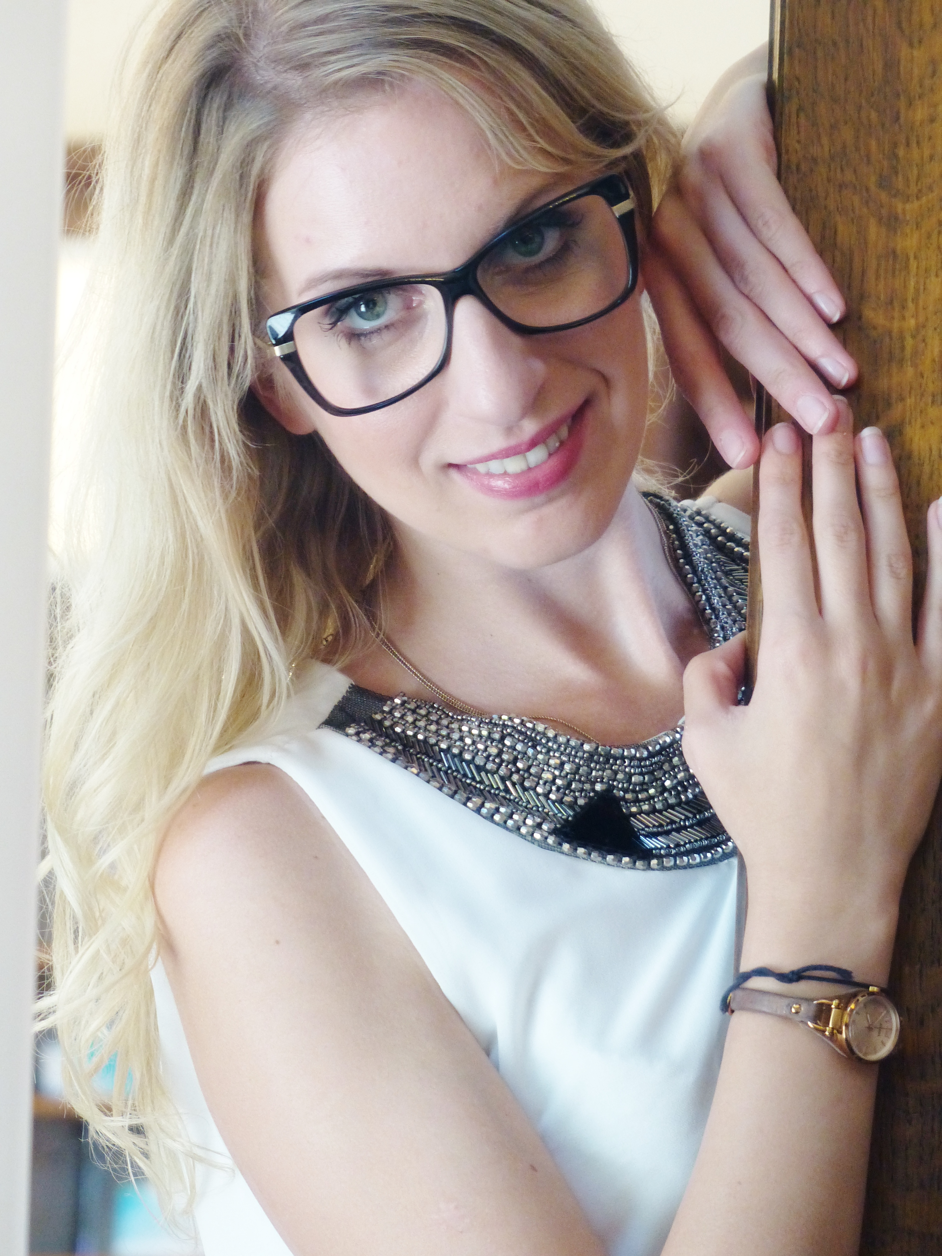Wegen der sommerlich warmen Temperatur habe ich mich für ein leichtes, weißes Sommerkleid entschieden. Hierzu brauche ich keinen Schmuck, da der Ausschnitt mit Perlen verziert ist. Das macht aus meinem schlichten Kleid einen richtigen Hingucker. An der Taille wird es mit einem Stoffgürtel gerafft. Die Andy Wolf Brille schafft den passenden Kontrast zu dem lieblichen Look.