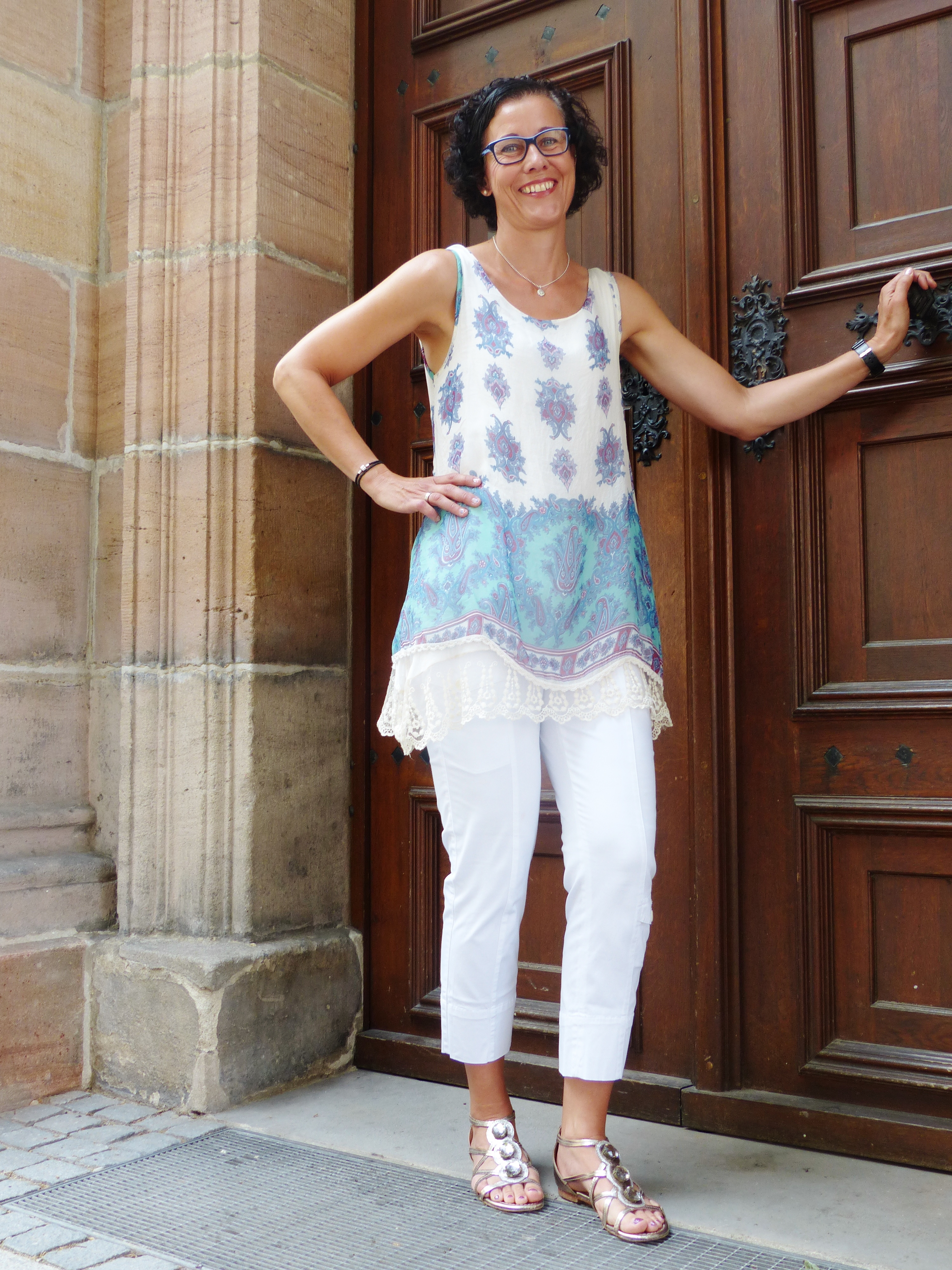 Bei diesen rekordverdächtigen Temperaturen habe ich mich für ein luftiges farbenfrohes Oberteil und eine klassisch weiße 7/8 Hose entschieden.