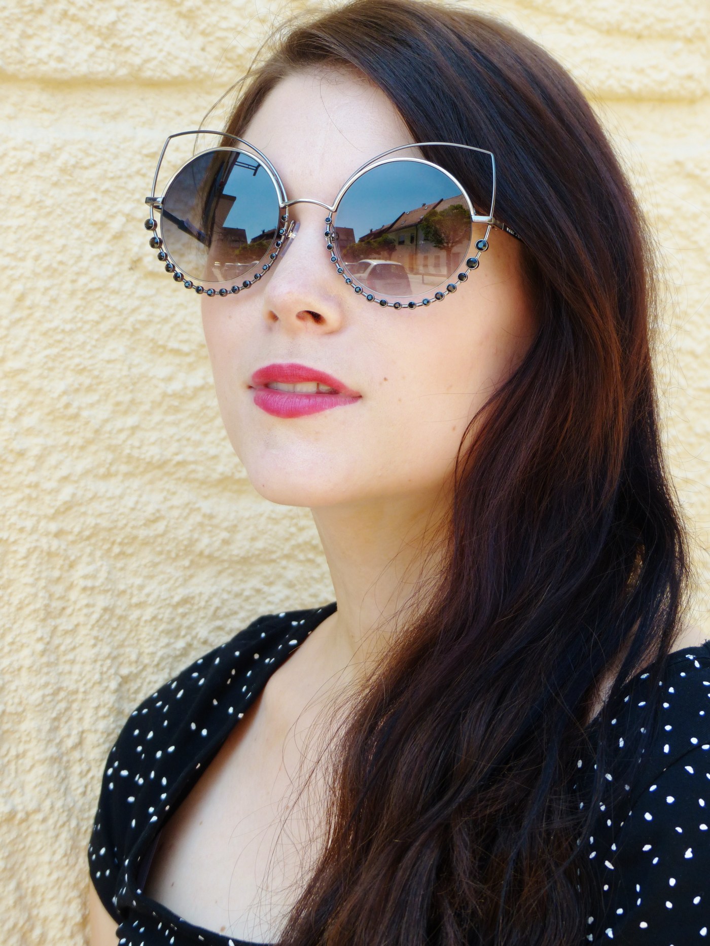 Durch die Spitzen über dem Fassungsrand hat die Brille sowohl eine Cat-Eye als auch eine runde Form. Die kleinen Steine am untern Fassungsrand geben zusätzlich noch das gewisse Etwas.