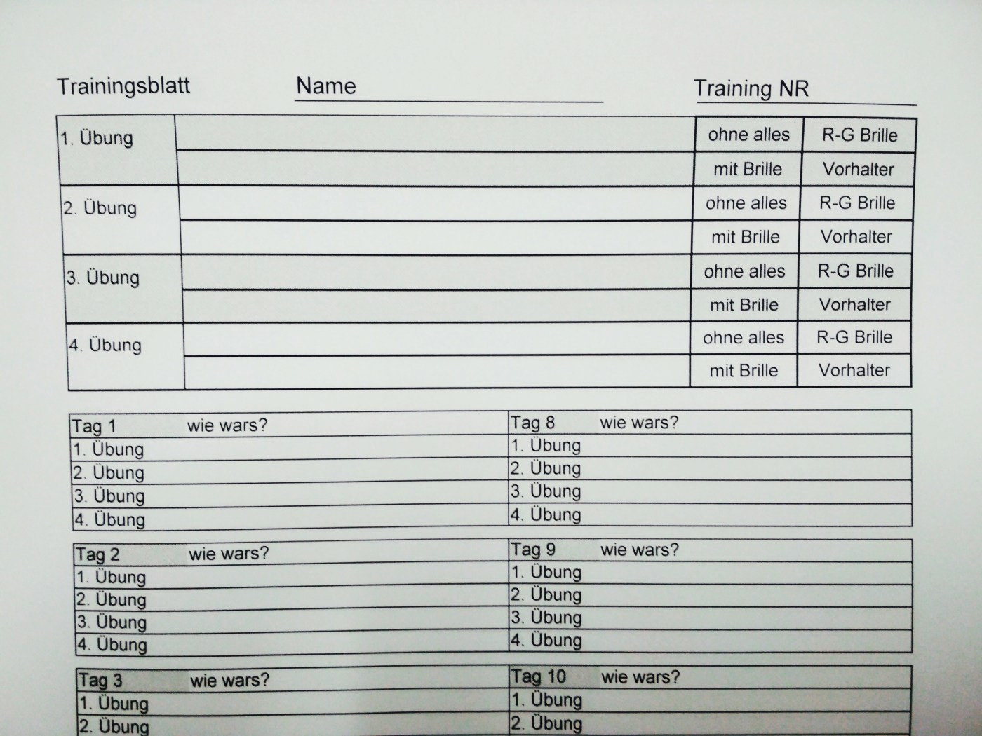 Bei jedem Termin werden Ihnen die Übung ausführlich erklärt und das Übungsmaterial mitgegeben. Diese werden Ihnen kostenlos ausgeliehen, bitte bringen Sie die Materialen zu jedem Termin wieder mit. Sie notieren sich jedes mal auf einem Protokoll, was zu tun ist, und wie die Übung für Sie war. Das ist ein wichtiges feedback für mich, um die Übungen entwicklungsgerecht auszuwählen.